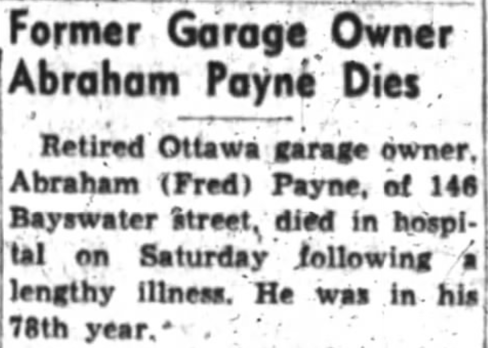 Abraham Payne was born in Breckenridge, Québec. He came to Ottawa in 1900, after he married Eleanor (Nellie) Dowd, and went into the contracting business. He enlisted in the 43rd Regiment during WWI and opened a garage business after he came home.