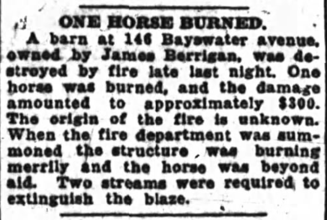 After the fire, the number of residents in Hintonburg increased by one hundred, because many displaced Rochesterville residents moved there. Some of them moved in with existing residents and others took advantage of the many empty lots to build new houses with their insurance payouts. It continued to be fairly countrified: indeed, a James Berrigan or Barrigan owned a barn located at 146 Bayswater which burned down in November of 1917. Sadly, one horse was burned beyond aid, and the damage cost $300 (the equivalent of over $6000 in 2025). It is not clear whether James Berrigan lived at 146 Bayswater at this time or simply rented space there, but the existence of his barn speaks to the type of homes that were built there. It may also indicate the proximity of the Experimental Farm.