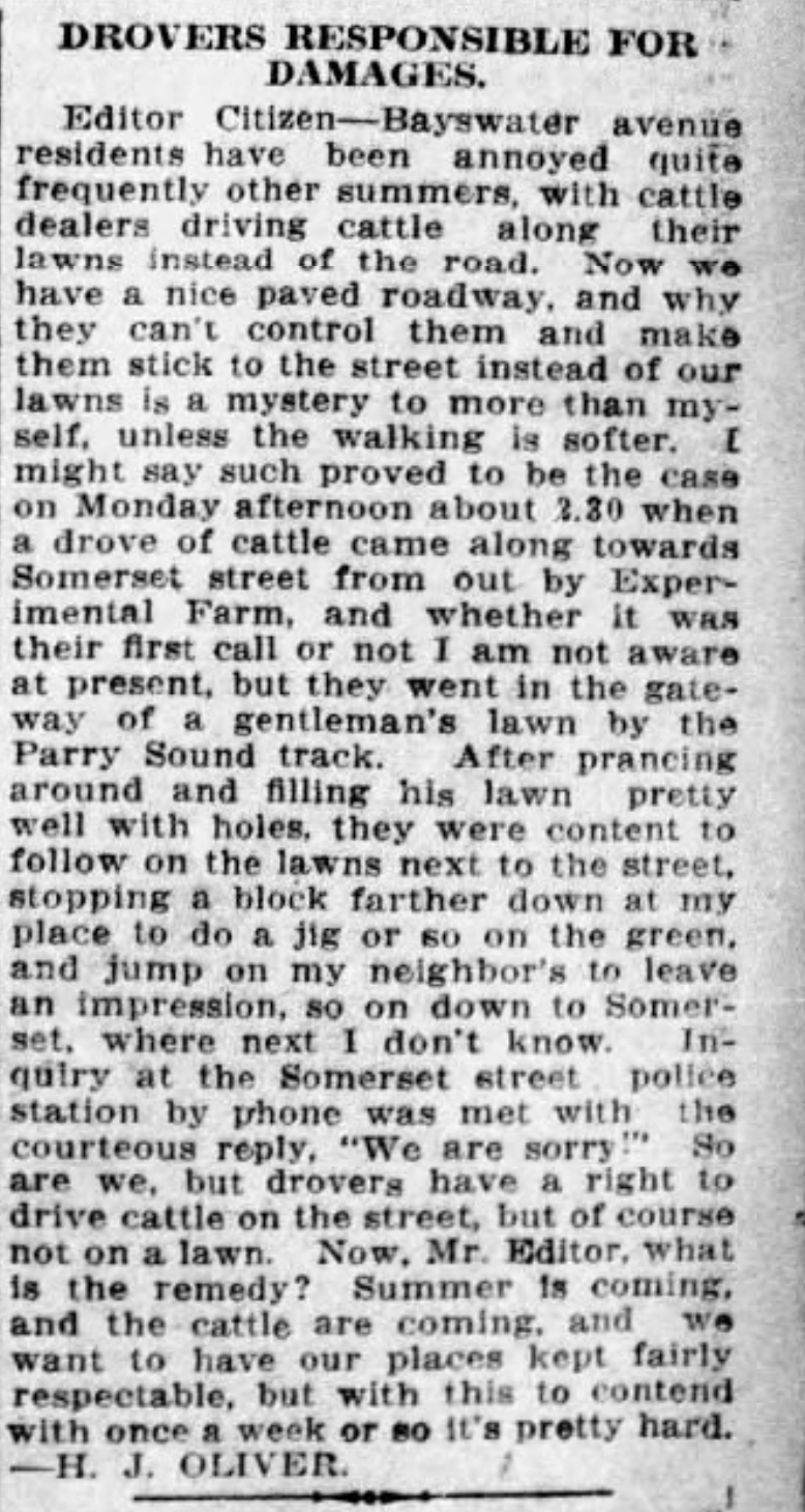 The area was surrounded by farmland. Much of it was owned by the Sparks Estate, and some of it belonged to the Experimental Farm. It seemed to be almost like the countryside, especially due to the proximity of the Farm. In the summer, cows would be driven from the Farm towards Somerset St. and walk over the lawns, much to the chagrin of the residents.