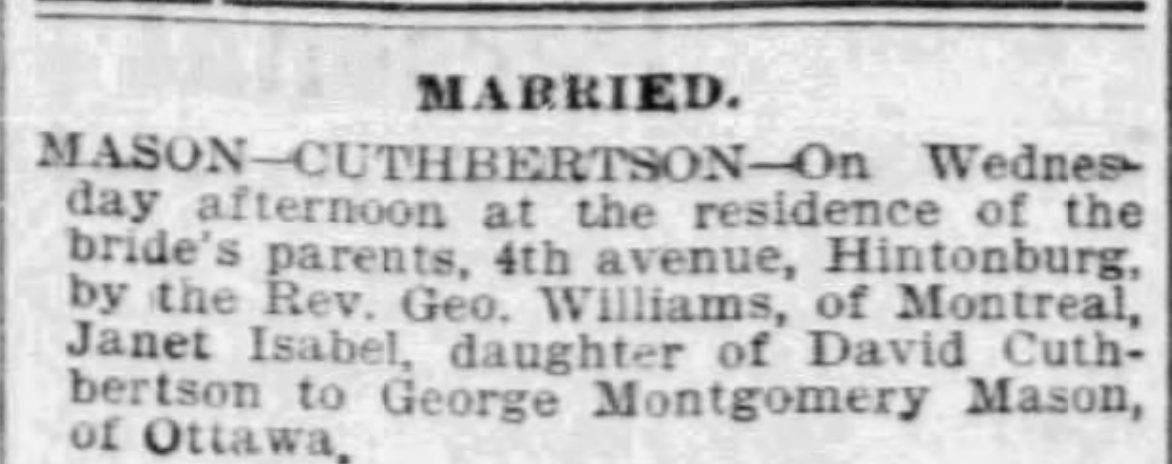 12025-07-31T20:56:20+00:00Ana Teoh90a351ae2281812636914606c5267b01964bd45c83D. Cuthbertson's Personal Life: Event 8plain2025-08-04T14:27:45+00:0012/13/1900Ana Teoh90a351ae2281812636914606c5267b01964bd45c“MASON-CUTHBERTSON—On Wednesday afternoon at the residence of the bride’s parents, 4th avenue, Hintonburg, by the Rev. Geo Williams, of Montreal, Janet Isabel, daughter of David Cuthbertson to George Montgomery Mason of Ottawa.”