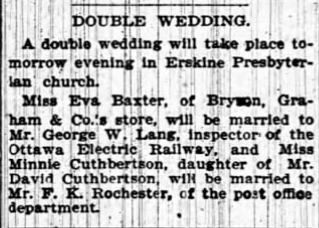 12025-07-31T20:50:47+00:00Ana Teoh90a351ae2281812636914606c5267b01964bd45c82D. Cuthbertson's Personal Life: Event 6plain2025-08-04T14:26:01+00:0012/21/1897Ana Teoh90a351ae2281812636914606c5267b01964bd45c“A double wedding will take place tomorrow evening in Erskine Presbyterian church. Miss Eva Baxter, of Bryson, Graham & Co.’s store, will be married to Mr. George W. Lang, inspector of the Ottawa Electric Railway, and Miss Minnie Cuthbertson, daughter of Mr. David Cuthbertson, will be married to Mr. F. K. Rochester, of the post office department.”