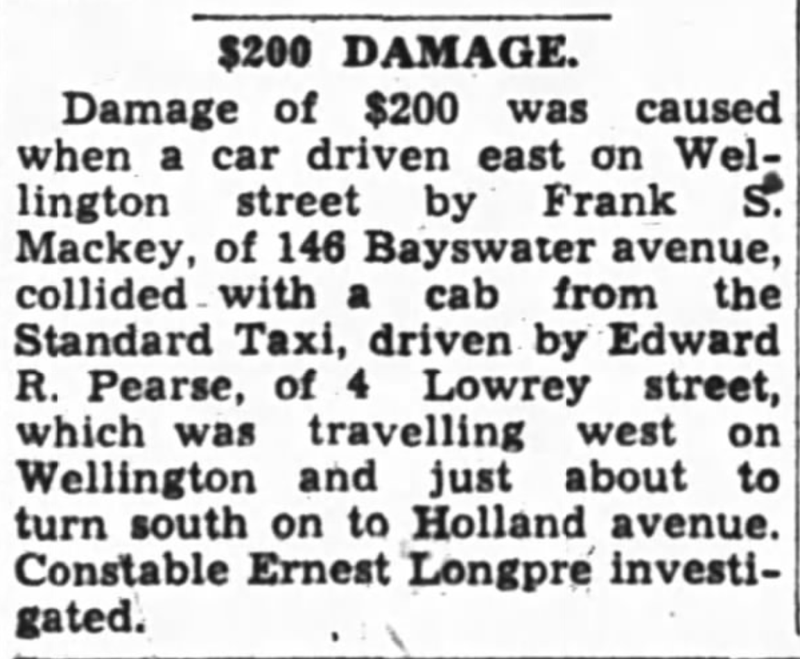 12025-08-01T13:07:49+00:00Ana Teoh90a351ae2281812636914606c5267b01964bd45c82Other Residents: Event 16plain2025-08-04T15:05:10+00:0012/23/1946Ana Teoh90a351ae2281812636914606c5267b01964bd45c“Damage of $200 was caused when a car was driven east on Wellington street by Frank S. Mackey, of 146 Bayswater avenue, collided with a cab from the Standard Taxi, driven by Edward R. Pearse, of 4 Lowrey street, which was travelling west on Wellington and just about to turn south on to Holland avenue.constable Ernest Longpre investigated.”