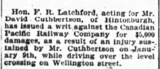 “Jon. F. R. Latchford, acting for Mr. David Cuthbertson, of Hintonburgh, has issued a writ against the Canadian Pacific Railway Company for $5,000 damages, as a result of an injury sustained by Mr. Cuthbertson on January 9th, while driving over the level crossing on Wellington street.”