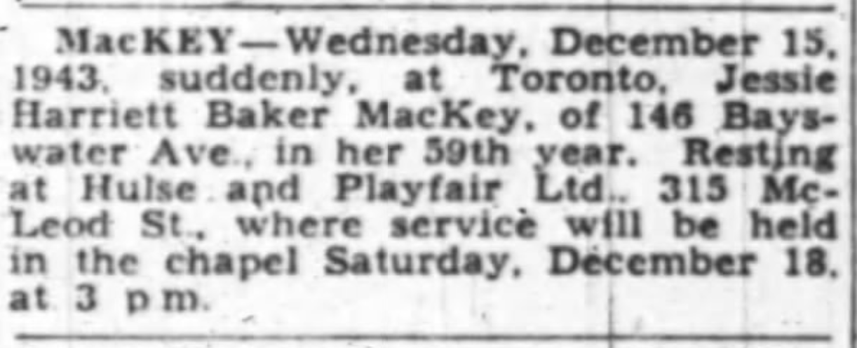 12025-08-01T13:02:25+00:00Ana Teoh90a351ae2281812636914606c5267b01964bd45c82Other Residents: Event 14plain2025-08-04T15:03:23+00:0012/20/1943Ana Teoh90a351ae2281812636914606c5267b01964bd45c“Wednesday, December 15, 1943. Suddenly, at Toronto, Jessie Harriett Baker MacKey, of 146 Bayswater Ave., in her 59th year. Resting at Hulse and Playfair Ltd., 315 McLeod St., where service will be held in the chapel Saturday, December 18, at 3 pm.”
