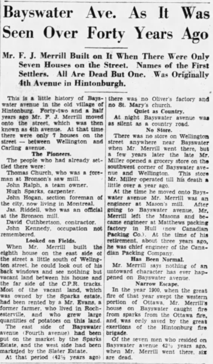 “This is a little history of Bayswater avenue in the old village of Hintonburg. Forty-two and a half years ago Mr. F. J. Merrill moved onto the street, which was then known as 4th avenue. At that time there were only 7 houses on the street — between Wellington and Carling avenue. The people who had already settled there were: Thomas Church, who was a foreman at Bronson’s saw mill. John Ralph, a team owner. Hugh Sparks, carpenter. John Hogan, section foreman of the city, now living in Montreal. Jas. Riddell, who was an official at the Bronson mill. David Cuthbertson, contractor. John Kennedy, occupation not remembered.”