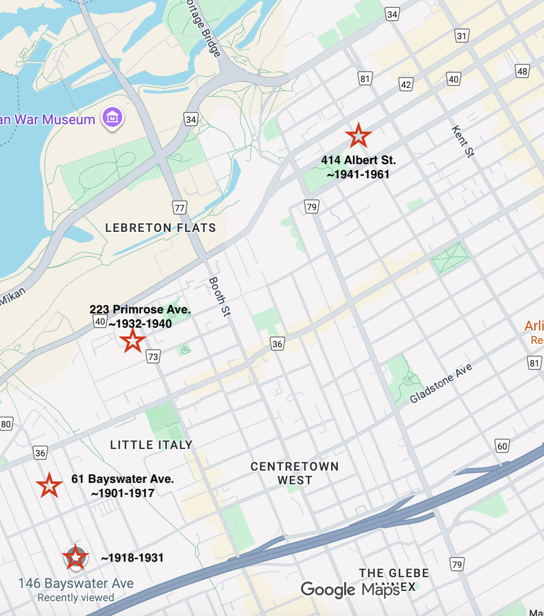 H. J. Oliver and his family lived in a few different homes over the years. The first mention in the newspapers states his place of residence as 61 Bayswater, where they stayed until around 1918. They moved into 146 Bayswater, where James Oliver, his father, lived before them. It is here that he spent the duration of his terms as Public School Board trustee, representing the Dalhousie Ward. Around 1931, the family moved to 223 Primrose Avenue—in Elmdale Ward—where he ran for alderman. Finally, around 1941, they moved to 414 Albert Street. There, it appears, he stayed until the end of his life.