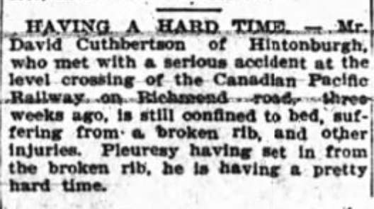 12025-07-31T20:58:01+00:00Ana Teoh90a351ae2281812636914606c5267b01964bd45c82D. Cuthbertson's Personal Life: Event 9plain2025-08-04T14:28:25+00:0002/04/1901Ana Teoh90a351ae2281812636914606c5267b01964bd45c“David Cuthbertson of Hintonburgh, who met with a serious accident at the level crossing of the Canadian Pacific Railway on Richmond road, three weeks ago, is still confined to bed, suffering from a broken rib, and other injuries. Pleuresy having set in from the broken rib, he is having a pretty hard time.”