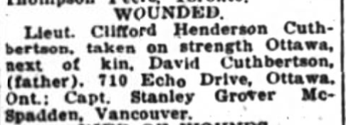 12025-07-31T21:18:54+00:00Ana Teoh90a351ae2281812636914606c5267b01964bd45c84D. Cuthbertson's Personal Life: Event 17plain2025-08-04T14:44:31+00:0008/20/1918Ana Teoh90a351ae2281812636914606c5267b01964bd45c“WOUNDED: Lieut. Clifford Henderson Cuthbertson, taken on strength Ottawa , next of kin, David Cuthbertson, (father), 710 Echo Drive, Ottawa, Ont.: Capt. Stanley Grover McSpadden, Vancouver.”