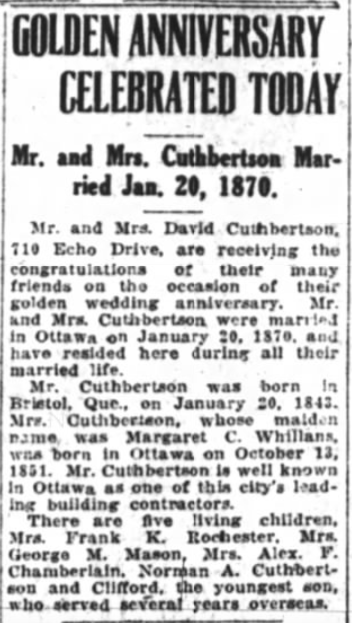 12025-07-31T21:22:04+00:00Ana Teoh90a351ae2281812636914606c5267b01964bd45c83D. Cuthbertson's Personal Life: Event 18plain2025-08-04T14:45:17+00:0001/20/1920Ana Teoh90a351ae2281812636914606c5267b01964bd45c“Mr. and Mrs. David Cuthbertson, 710 Echo Drive, are receiving the congratulations of their many friends on the occasion of their golden wedding anniversary. Mr. and Mrs. Cuthbertson were married in Ottawa on January 20, 1870, and have resided here during all their married life.”