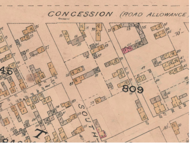The 1896 fire that would rip through Hilda Street, spared Ruggles house, and luckily a fire insurance plan from the previous year allows us to reconstruct the homes. In 1895 only eight homes faced onto hilda: