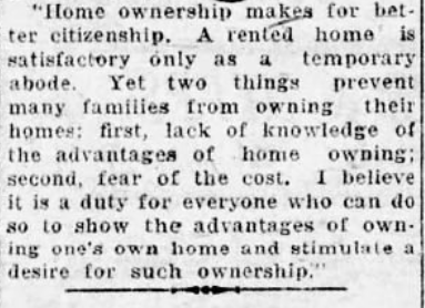 The popular press in early 1900s stressed home ownership as a proof of one's hard work, economic toil, and commitment to community, with the Ottawa Journal “telling its readers that home ownership would make an individual a better citizen and that pride in one's home was an important ingredient in one's own self-pride.” Since many of the houses built during the area's time as Manchesterville were constructed by their residents, for the first time one could have “a personalized house within his/her grasp.” A 1925 Ottawa Citizen article makes this clear: