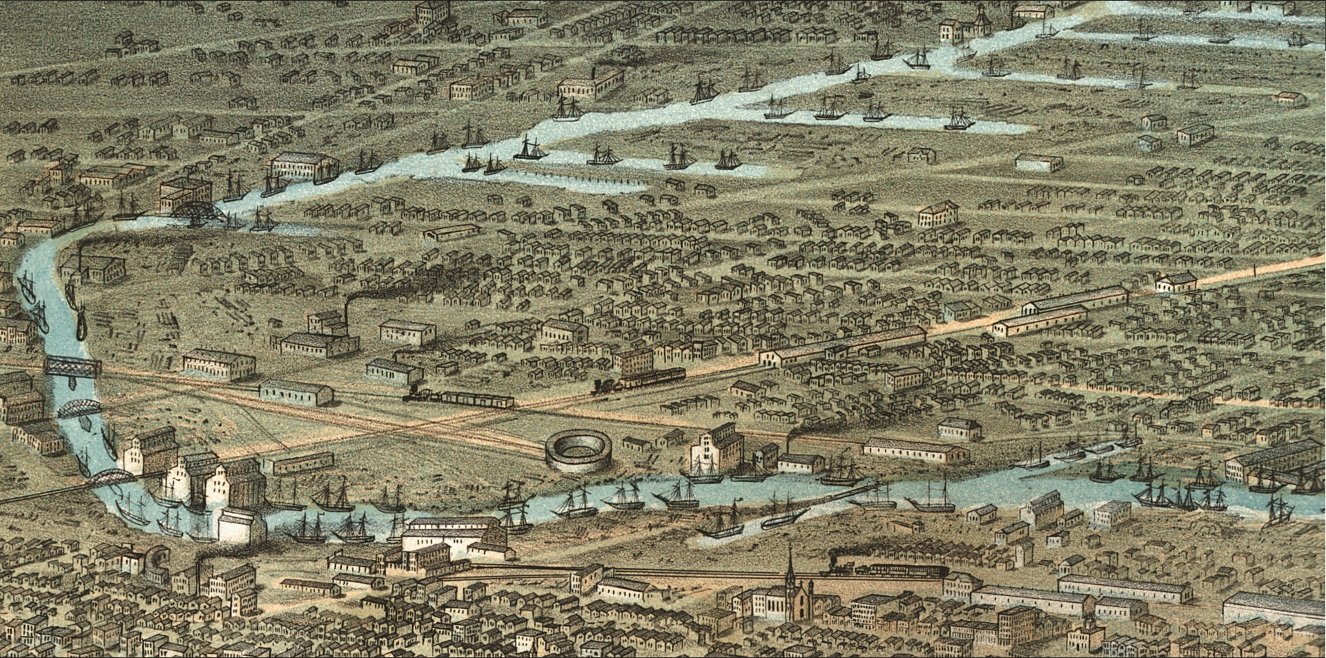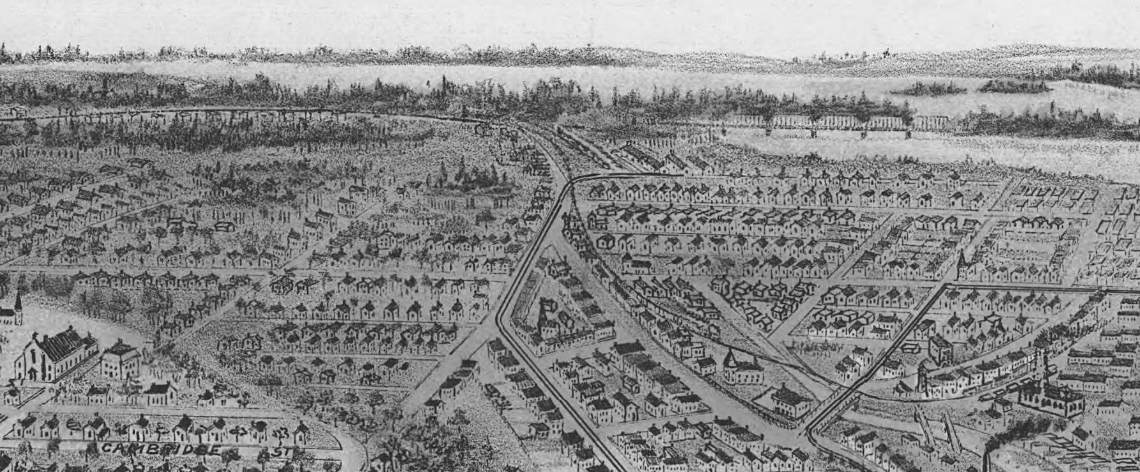 Hintonburg’s worker’s cottages are vernacular, that is, they are buildings without a formal style, but that does not mean that its type does not have any history. In fact, the worker cottage as a type of building is very typical for late 19th urban housing. A 1868 birds eye map of Chicago shows mass crowdings of worker’s cottage’s on the outskirts of the city, crisscrossed by rail and dotted throughout with the belching smoke stacks of industry: