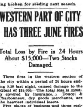 On June 2nd, 1915, the Maclean Block experienced its first fire. The fire started at 9:30 PM. Doubt & Charbonneau Dry Goods (located at 1016 - 1020 Wellington) experienced the most damage, bot to its property and stock, however four other businesses and a few residences were also affected.A police officer, called Officer Lord, was the first to alert the local fire department about the fire. Station No.11, located on Parkdale, was only a 700-metre drive from the Maclean Block. Unfortunately, Fire Chief Graham and the rest of the fire department arrived after the fire had spread throughout the building. The fire department experienced a shortage of equipment in 1915, and had only two working hoses to put out the fire. In total, around $12,000 of damage occurred (which is equivalent to our $300,000 today). The fire was determined to have started in the ceiling of the dry goods store and the apartment above, which belonged to Mrs. P. O'Meara, the building was not damaged beyond repair.