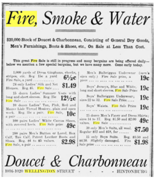 Doucet & Charbonneau had a fire sale to sell off their damaged goods at a reduced price. Fortunately, they did not have to close shop.
