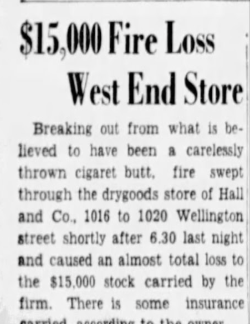 On August 23, 1938, the Maclean Block caught once again. Like in 1915, the dry goods store at 1016-1020 Wellington, now called Hall and Co., was where the fire started and the property that experienced the most damage. It is believed that an unsupervised cigarette was the culprit. This time, the store lost $15,000 in stock, which today is equivalent to almost $400,000. The store next door, Fauteaux and Fauxteaux painters, also lost a significant amount of stock. The apartments above housed 12 families between their 11 apartments. All were forced to leave their homes due to smoke, but none of the apartments experienced significant damage and all were able to return shortly after the fire had been put out.The Fire of 1987: Faulty Wiring... Again!