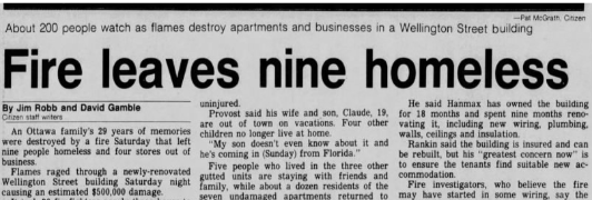 The most recent fire documented at the Maclean Block occurred on March 23rd, 1987. The fire began around 5:15 PM, destroying four of the eleven apartments and four of the seven stores. In total, nine individuals lost their homes and four of the businesses on the first floor closed. René Provost, his wife, his son Calude, and daughter Ginette all lived in one upstairs units destroyed by the flames and were forced to find alternative shelter. As for stores, Lino's Pasta, the ABC Gift Co, Silver Salver and the Wishbone Gift Shop were all put out of business.It was in the Wishbone gift shop, located at 1024 Wellington Street and owned by Gordon Jobson, that the fire started seemingly due to faulty wiring. Gordon Jobson had opened his shop only one month prior, and admitted he would not be able to start another business due to the financial loss.
