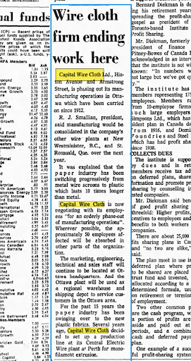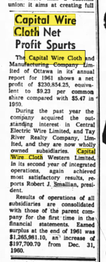 - “Capital Wire Cloth Net Profit Spurts” The Ottawa Journal, April 18, 1962, 29.