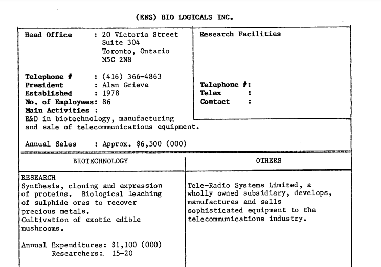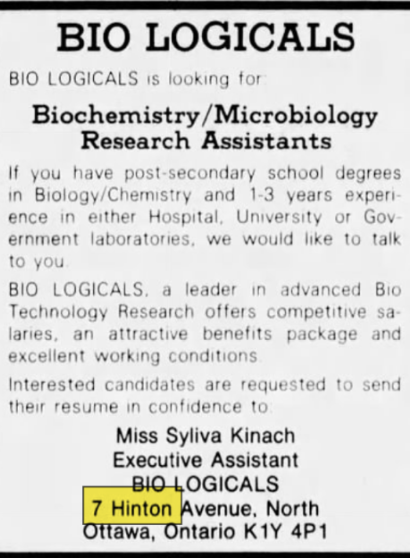 Following the proposal to revitalize the space, no action appeared to have happened in regards to developing the Parkdale Market in this space. Between the mid 1970s until 1983, it is unclear who exactly inhabited the space. While the Capital Wire Cloth Factory had been using the building for other operations outside of the manufacturing, the extent or duration of the presence is unknown. In August of 1982, an advertisement for the company BIO LOGICALS, a BioTechnology Research company, began searching for research assistants using the 7 Hinton Avenue address.Delving into the corporate history of this company, the name BIO LOGICALS has been in use between March 1979 to June 1987 before changing to ENSCOR INC. While the main office for this company was in Toronto, it is possible that 7 Hinton Avenue was used as a research space in the 1980s as the company appears at this address in directories as late as 1986.