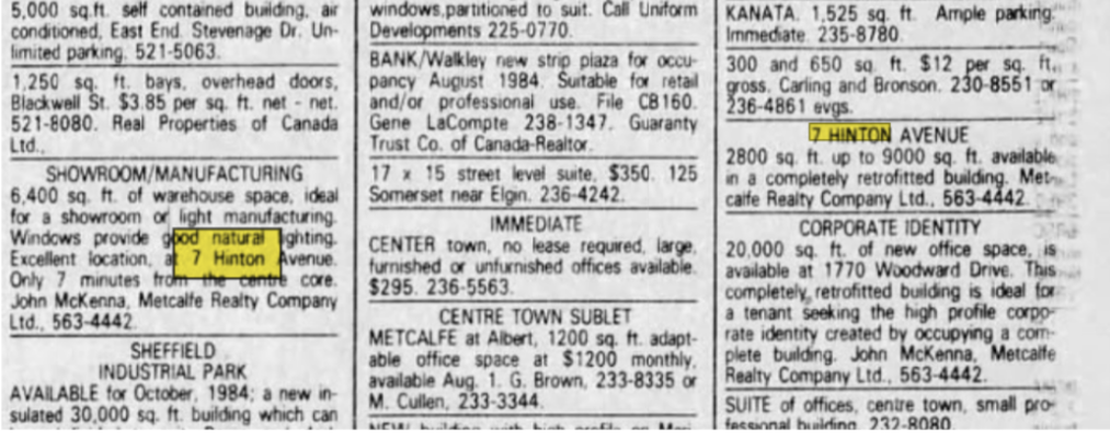 In 1983 Metcalfe Realty Compact Limited acquired & Hinton Avenue, and has owned the land ever since. That same year, Barry Padolsky, a heritage architect, led the rehabilitation of the entire site, preserving almost all external features of the previous Wire Cloth Factory. With almost 6,400 sq. Ft. of warehouse space, there was ideal space for a showroom of light manufacturing, retail, and office space, as advertised in 1984.The history of 7 Hinton Avenue and its occupants is less documented following 1983. Most famously, The Hintonburg Animation Studios, which produced the "Racoons" cartoon series, inhabited the space sometimes in the mid 1980s. During this time as well, it can be assumed that BIO LOGICALS had been a tenant during the period on 1982-1986. By 1992, three confirmed tenants: Armstrong Intersects, Lacewood Animation Studio, and Vogue Brassieres Inc. called 7 Hinton their home. In 1993, Wildlife Habitat Canada and their French counterpart Habitat Fanique Canada, started renting space at the address. By 2000, Canadian Arctic Resources Committee, Habitat Faunique/Wildlife Habitat Canada, Wetlands International, and Vogue Brassieres Inc. used the space.