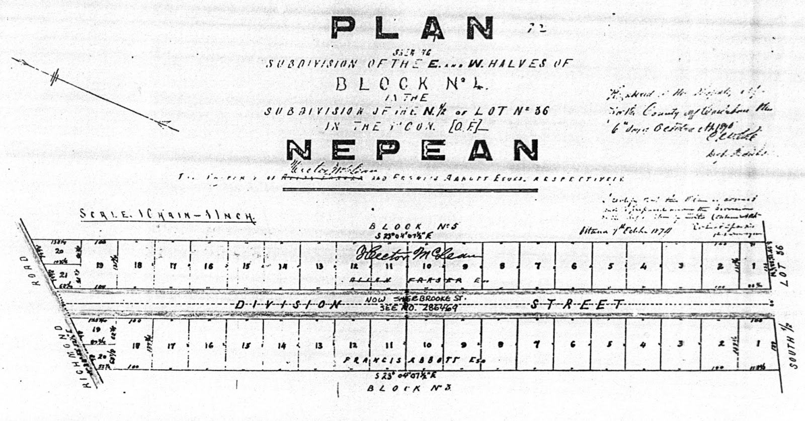 Hale's property was then split after it came under the ownership of John Henry. Heney split Block 4 into East and West halves, sold to Captain Allan Fraser (1867) and Francis Abbott (1863), respectively. Together, Abbott and Fraser devised a subdivision plan for what would then be known as Division Street.