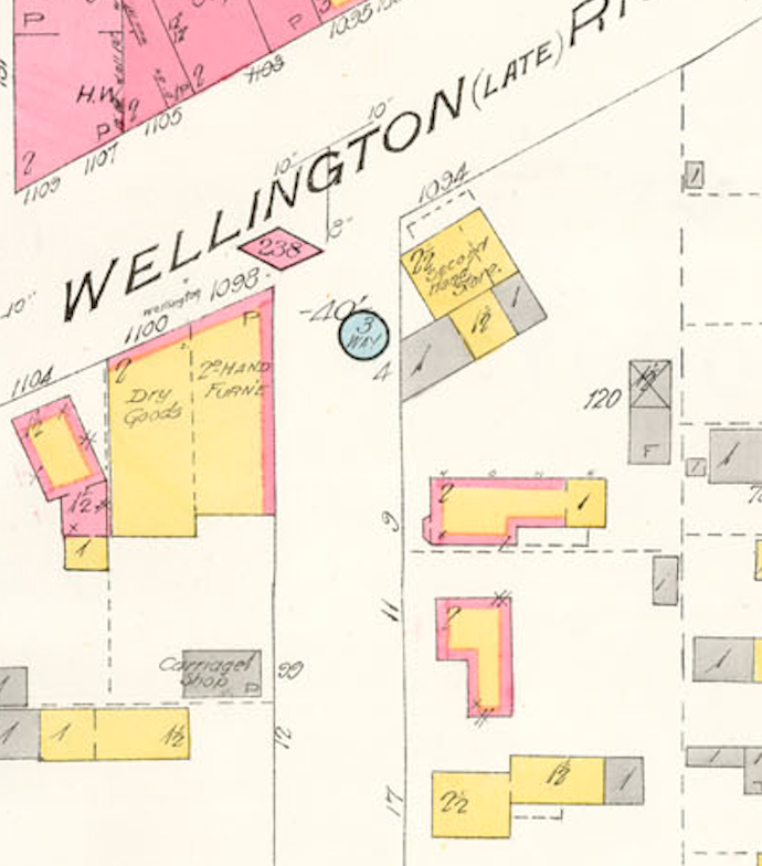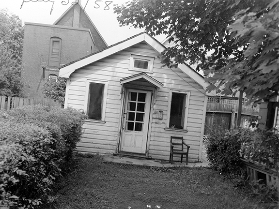 This building (fig. 4) is a two-story wood construction jacketed in a red brick veneer like much of the neighbourhood. It is representative of the gable-front type, seen in the narrow, triangular side of the house facing the street. In what would be its "original" form it boasted eight rooms in a prime location "one minute from [street] cars" (fig. 5).