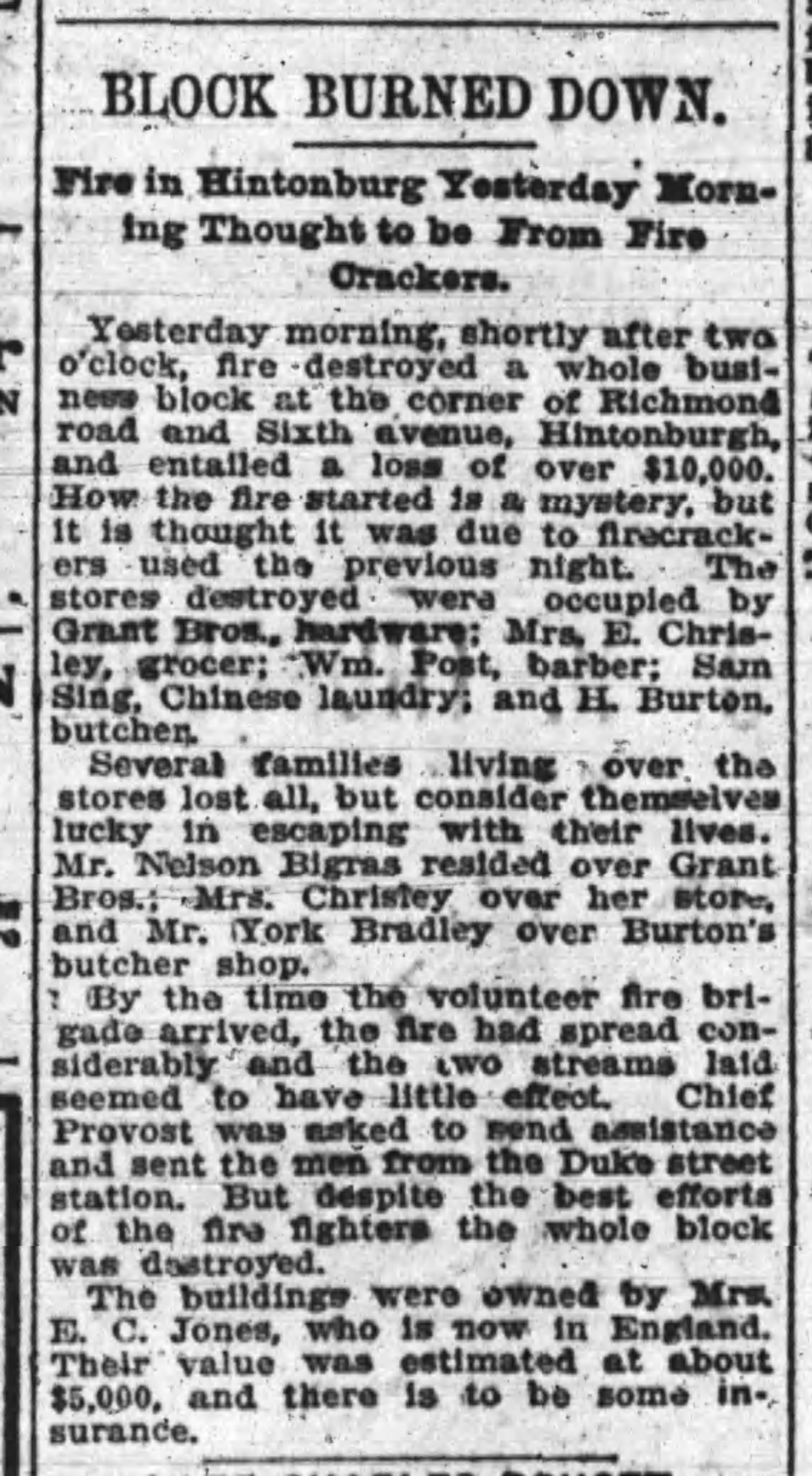 Edward inherited not just a family name but also the ambition and practical skills of builders and entrepreneurs. E.C. Jones began appearing in Ottawa’s historical record in the 1890s. By 1896, he was contesting municipal tax assessments on Hintonburg properties and running a planing mill on Fourth Avenue, which unfortunately suffered fire damage in 1897. That same year, he began constructing a three-storey brick store at the corner of Sixth Avenue and Richmond Road—what would become known as Jones Block. The original Jones Block was a mixed-use building that quickly became integral to the village’s commercial life. Unfortunately, the building was destroyed in a fire in May 1902, while Jones was abroad in England. The fire caused over $10,000 in damages, displacing families and destroying multiple businesses. However, Jones responded not with retreat, but with resilience and reinvestment. By October of that same year, he had commissioned local contractor D. McArthur to rebuild the block on a grander and more elaborate scale. The new Jones Block was described in 1903 as “the finest commercial block in the municipality.”