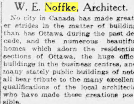 Few architects have had as great an influence over Ottawa's built environment as Werner Ernst Noffke. His rich career began in 1901 and continued until his death in 1964. He contributed to the built heritage of cities across Canada and the States, but played an especially significant role in developing Hintonburg's commercial strip.